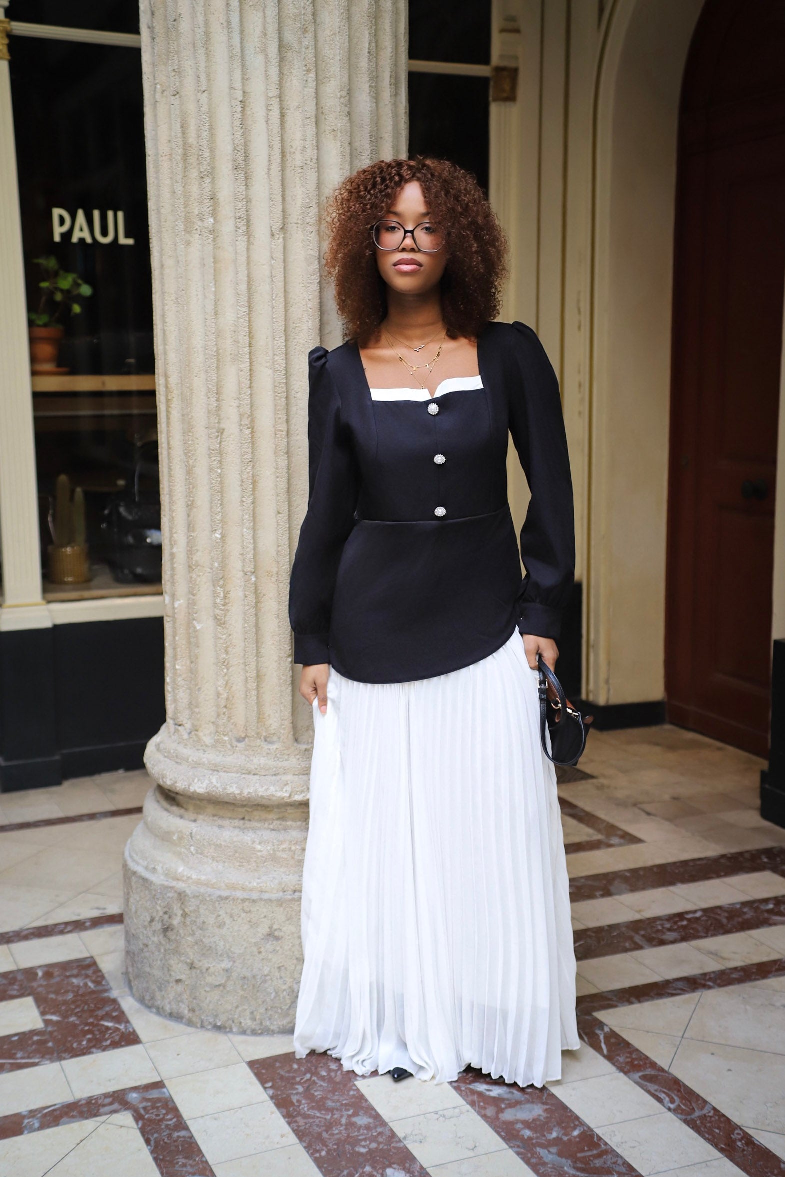 Robe longue bicolore à l’élégance classique, composée d’un haut structuré et d’une jupe plissée fluide. Une silhouette raffinée où minimalisme et esprit couture se rencontrent avec justesse.